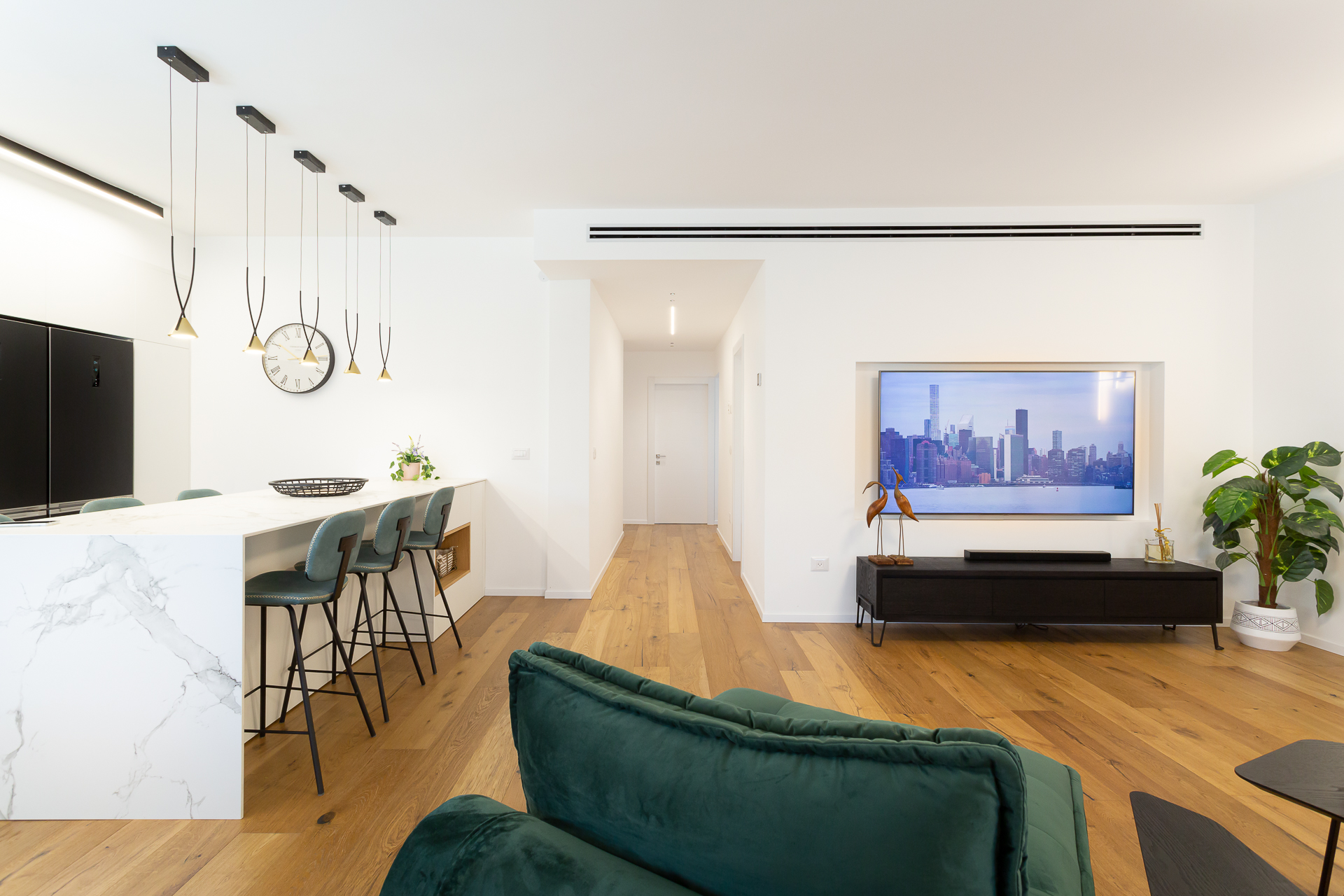 בסלון הכנסנו גוונים של ירוק שמשתלבים נהדר עם גוון העץ של הפרקט.