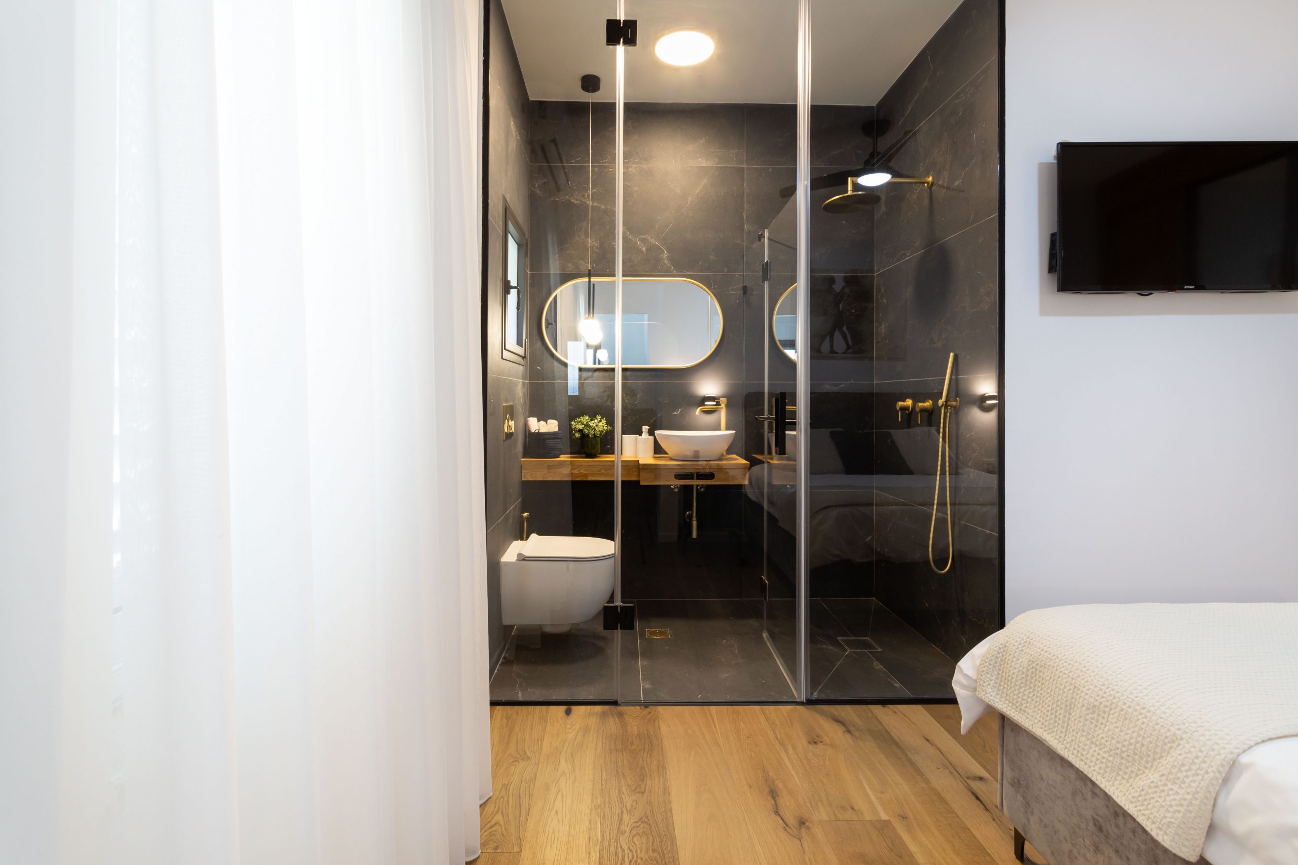 את חדר הרחצה של ההורים עצבנו בגוונים כהים .היות ורצינו לנצל כל פיסה של מקום בחדר הרחצה של ההורים יצרנו קיר זכוכית במקום קיר רגיל, מה שהוסיף אלגנטיות ויוקרה גם לחדר השינה.